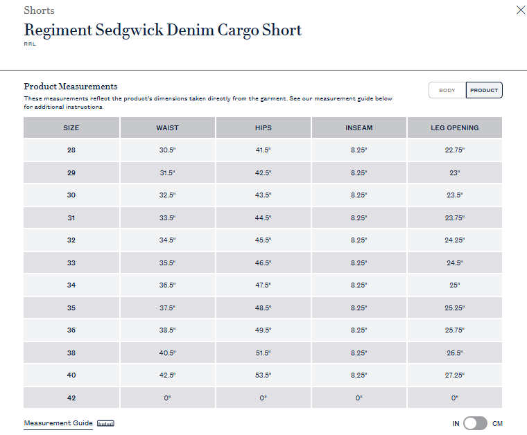 - All sizes have an 8" inseam. Size 32W has a 12" rise.