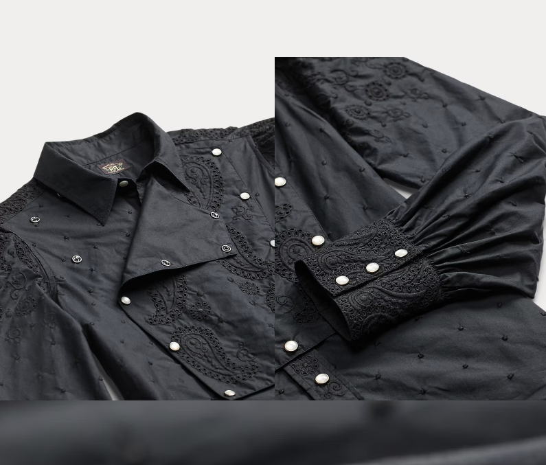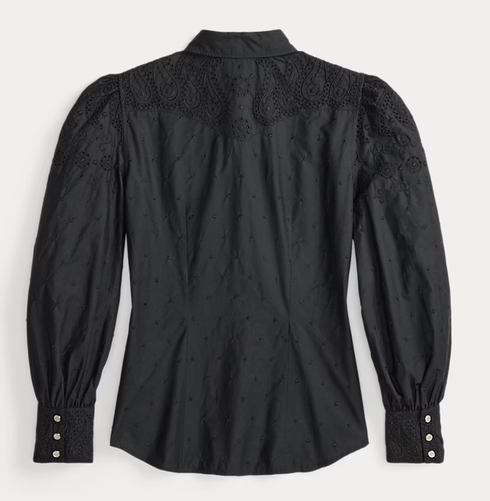Description: Lightweight woven cotton blouse modeled after a garment from the 1890s. Antique-inspired tonal open-work embroidery throughout. Bib front and puffed sleeves. Western-style back yoke and cuffs. Genuine mother-of-pearl button at the collar. Pearlescent snaps.